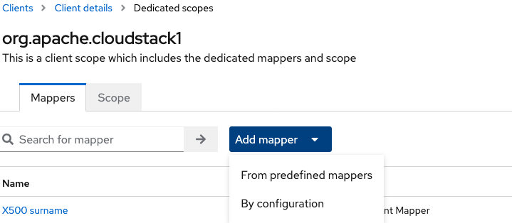 Go to Clients → Client Scopes > Select org.apache.cloudstack-dedicated