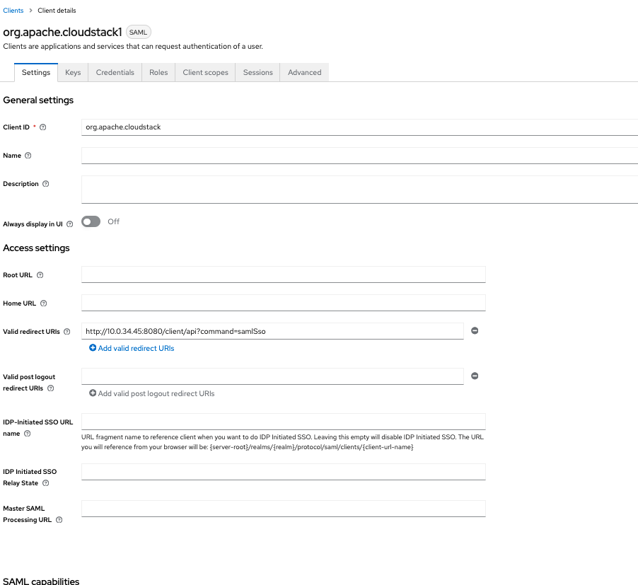 saml2.enabled=true saml2.default.idpid=http://app.example.com saml2.idp.metadata.url=http://10.0.32.236:8080/realms/kiranchavala/protocol/saml/descriptor saml2.redirect.url=http://10.0.32.234:8080/client saml2.sp.slo.url=http://10.0.32.234:8080/client saml2.sp.sso.url=http://10.0.32.234:8080/client/api?command=samlSso saml2.user.attribute=email