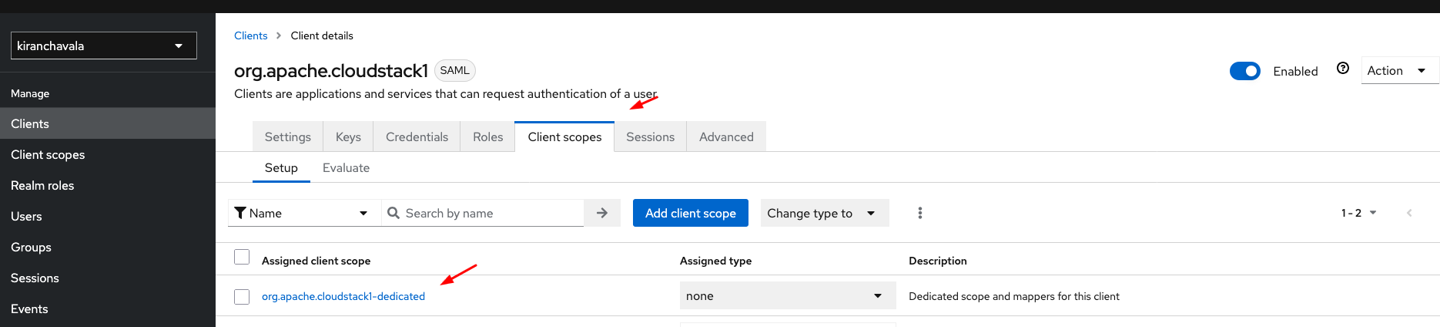 Go to Clients → Client Scopes > Select org.apache.cloudstack-dedicated